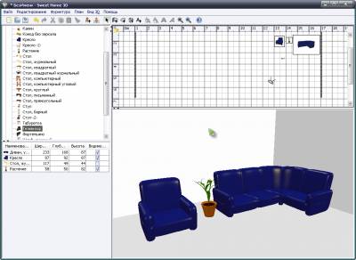 Sweet Home 3D позволит Вам предварительно просмотреть получившийся интерьер в 2D режиме (вид сверху), а также визуализировать конечный вариант расстановки мебели в 3D режиме. Хоть и качество визуализации и оставляет желать лучшего, но со своей основной задачей Sweet Home 3D справляется.