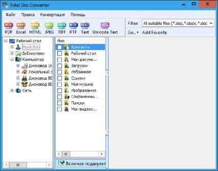 Total Doc Converter решает проблему конвертирования Doc файлов в PDF, HTML, XLS, JPG, TIFF или Text. Total DOC Конвертер умеет приводить все DOC файлы к единому форматированию. Если у вас 1000 doc файлов и у всех разное форматирование, просто задайте нужные настройки в Total DOC Converter.